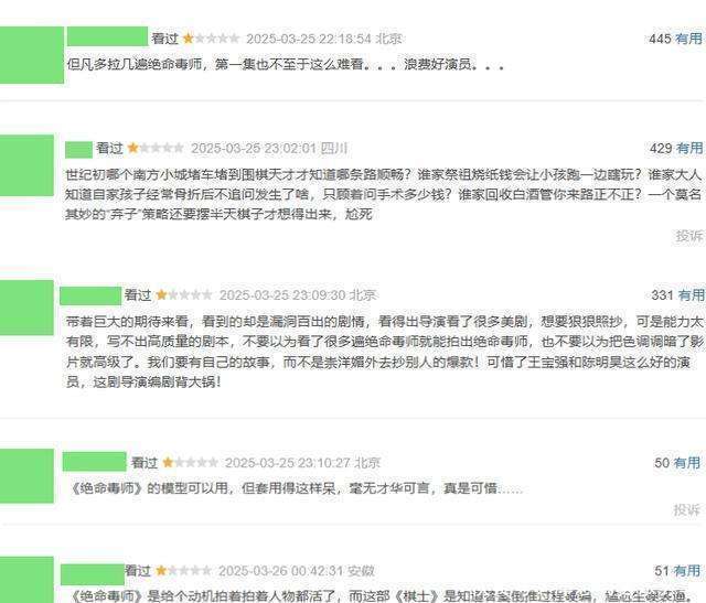 然而,理想很丰满,现实却很骨感。这部剧的收视率倒是没让观众失望,一上星央视就直接冲上后黄金档全国收视第一,那势头就如同离弦之箭,迅猛无比。可这好景不长啊,当我们满怀期待地打开评论区时,却像是被一盆冷水从头浇到脚。这部剧的差评那是如潮水般涌来,观众的差评理由出奇的一致:“漏洞百出”、“尴尬生硬”、“浪费好演员”。这就像是一场盛大的演出,表面上热闹非凡,台下却嘘声一片。我想问,《棋士》这部剧还能复刻《漫长的季节》的成绩吗?它到底怎么了?